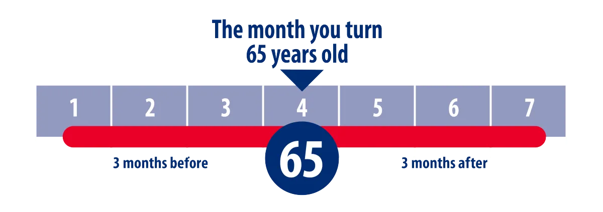 This is the time frame most people sign up for Medicare. A seven-month period, starting three months before the month in which you turn 65 and ending three months after that month (assumes you do not delay enrolling in Medicare Part B plan).